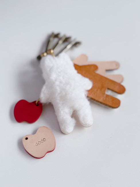 初出店のノベルティはJM BEAR キーリングワークショップの他にもう1点お買い上げいただきましたお客さまに、箔押し機でお好きな5文字を金箔押しした赤いりんごチャームをプレゼント。