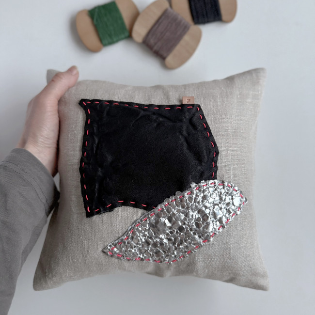 A:お好きな革を縫い付けるリネンミニクッションワークショップ